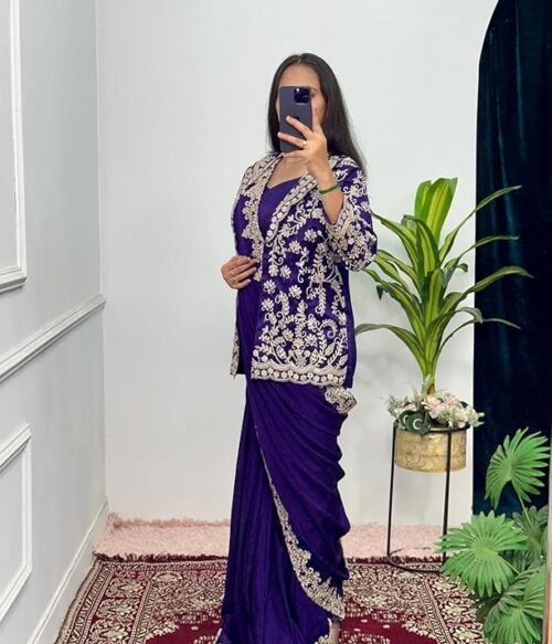 Ready To Wear Saree & Koti Set For Women Bollywood Style Chinon Silk Fabric On Embrodery Sequance Cording Work