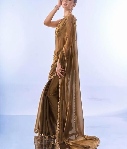 Women’s Organza Lightweight Lace Work Saree With Art Silk Sequence Work Golden Unstitched Blouse Piece