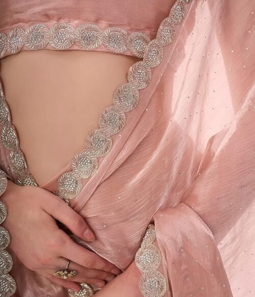 Women’s Satin Chiffon All Over Fix Diamond With Lace Work Saree With Matching Unstitched Blouse Piece
