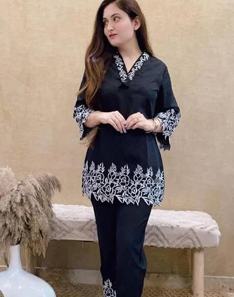 Women’s Rayon Fabric 3/4 Sleeves Collared Neck Thread Embroidery Cord Set