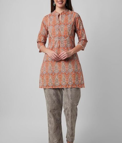 Women’s Cotton Short Kurta with Pants – (Orange)