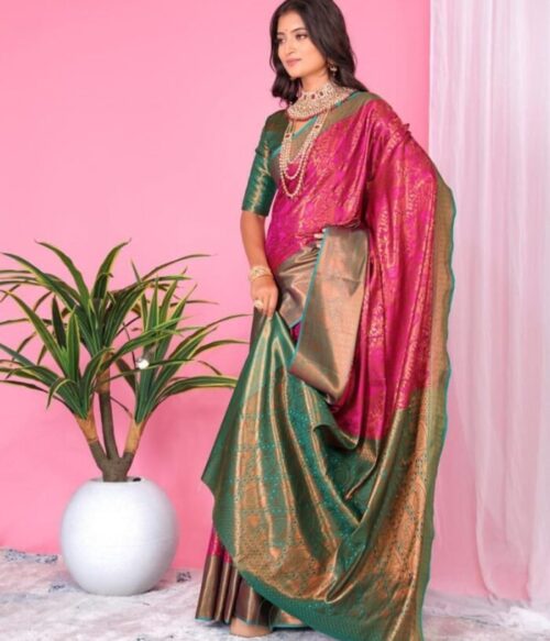 Fabric – Silk Pattern – Woven Occasion – Wedding Type of Work – Tassels Blouse Subcategory – Unstitched Care instructions – Dry Clean Pack contains – 1 Saree, 1 Unstitched Blouse