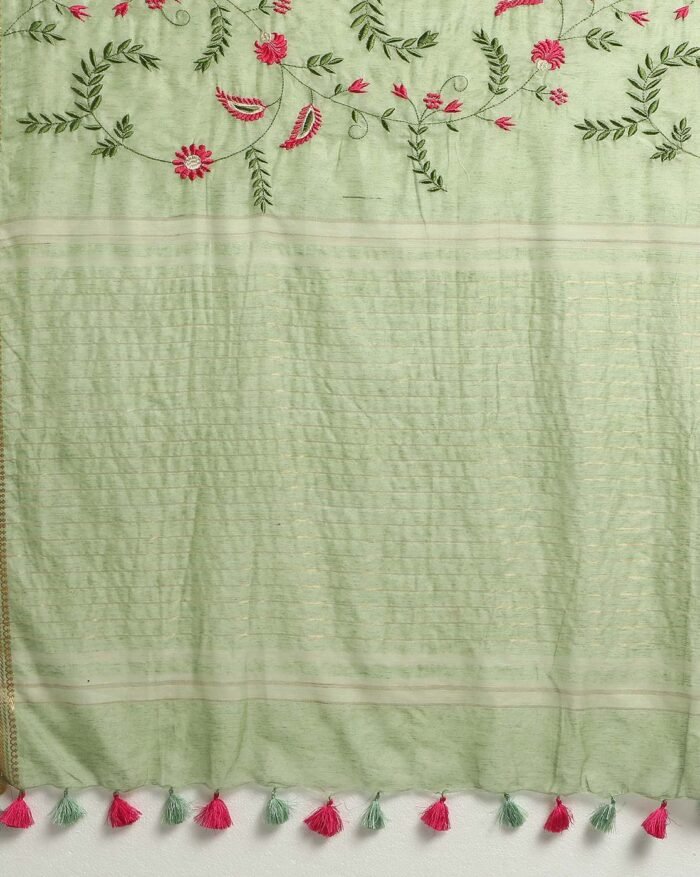 Product Details Hand dyed textiles may exhibit characteristic imperfections such as slight variations in color intensity and shade, which are inherent to the traditional artisanal techniques used in the dyeing process. Additionally, colors may fade or bleed over time due to the natural dyes and pigments employed. These variations contribute to the unique beauty and individuality of each hand-dyed piece and should be embraced as part of its artisanal charm A traditional way of weaving textiles, solely by hand, craftsmen and weaving clusters create unique ways of rendering the weaves that are distinct to their region, yarn and craft. Yellow linen silk saree has floral embroidered pattern, the pallu has tasseled hem Linen textile is made from the fibers of the flax plant, renowned for its strength, durability, and coolness. This natural fabric has a crisp texture and a distinctive luster, making it ideal for clothing, home textiles, and furnishings. Linen, treasured by all ages is highly absorbent and breathable,great fit for every season . It possesses natural antibacterial properties and becomes softer and more supple with each wash, adding to its appeal and longevity. Zari Borders are characterized by the use of golden and silver color yarn and accentuate the looks and richness of the of the saree Floral embroideed silk linen Blouse piece length: 0.80 m Saree length: 5.5 m; width: 1.10 m Package contains: 1 saree with blouse piece The last image gives a detailed look of the blouse piece that comes with this saree (The model is wearing a blouse from our in-house wardrobe) Dry clean Classic Linen silk