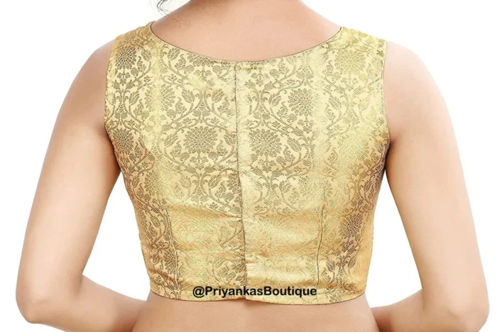Golden Banarasi Silk Saree Blouse, Readymade Saree Blouse, Indian Blouse, Short Top, Sleeveless Saree Blouse, Boat Neck Women’s Sari Blouse