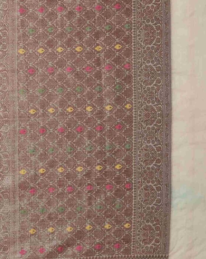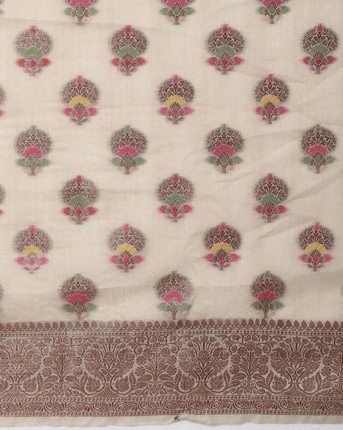 Product Details Hand dyed textiles may exhibit characteristic imperfections such as slight variations in color intensity and shade, which are inherent to the traditional artisanal techniques used in the dyeing process. Additionally, colors may fade or bleed over time due to the natural dyes and pigments employed. These variations contribute to the unique beauty and individuality of each hand-dyed piece and should be embraced as part of its artisanal charm. This is a genuine handwoven piece, slight unevenness in the selvedge and weave may be observed, which is inherent to the manual weaving process. Additionally, colors may fade or bleed over time due to the traditional dyeing methods employed. These characteristics contribute to the unique authenticity and artisanal quality of each handwoven textile and should be appreciated as part of its inherent charm and beauty. Munga is a silk yarn spun with the broken tussar filament. Silk textile is crafted from the natural protein fiber produced by silkworms during the process of silk production. Known for its luxurious feel, lustrous appearance, and smooth texture, silk has been prized for millennia. This exquisite fabric is used in high-end fashion garments, accessories, home furnishings, and decorative items, reflecting its status as a symbol of elegance and sophistication across cultures worldwide. Banarasi products are characterised by brocade borders & pallus. They often have woven butas or Jaal on the body. Luxurious weaves with an intense color scheme are their specialty, along with jewel-toned brocades, zari, quality silk, and lavish embroidery.This resplendent banarasi design is handpicked from skilled craftsmen and one of the finest in the country. Buta and Butis are names given to motifs in Indian traditional textiles. A small motif on its own is called a Buti. Butas are larger than butis. Blouse piece length: 0.80 m Saree length: 5.5 m; width: 1.10 m Package contains: 1 saree with blouse piece The last image gives a detailed look of the blouse piece that comes with this saree (The model is wearing a blouse from our in-house wardrobe) Dry clean Pure handloom tussar silk