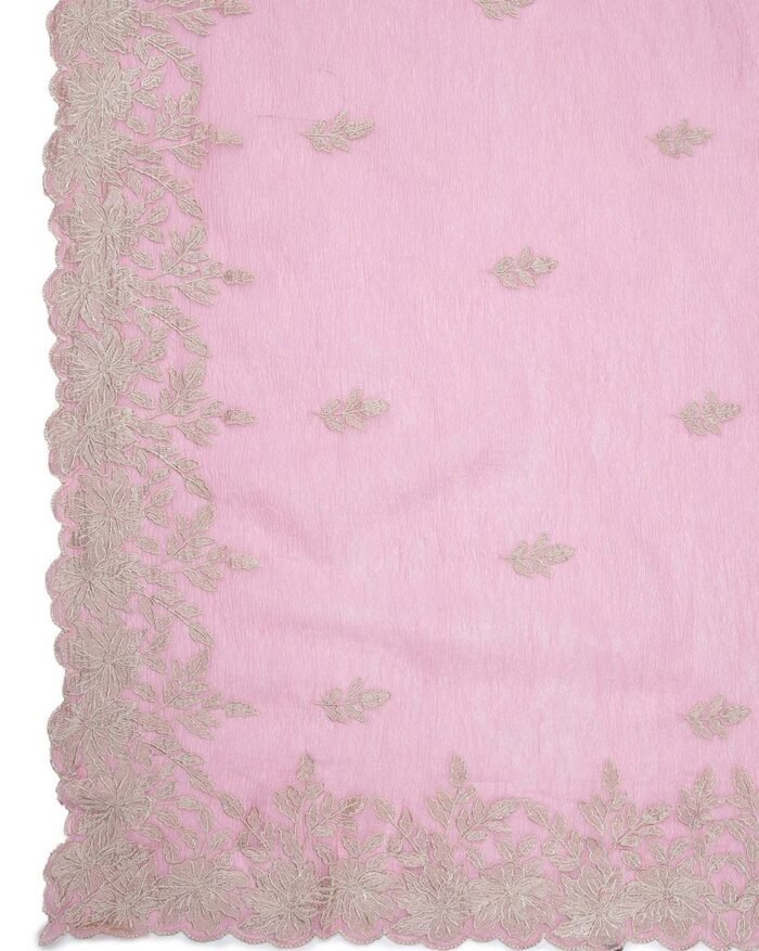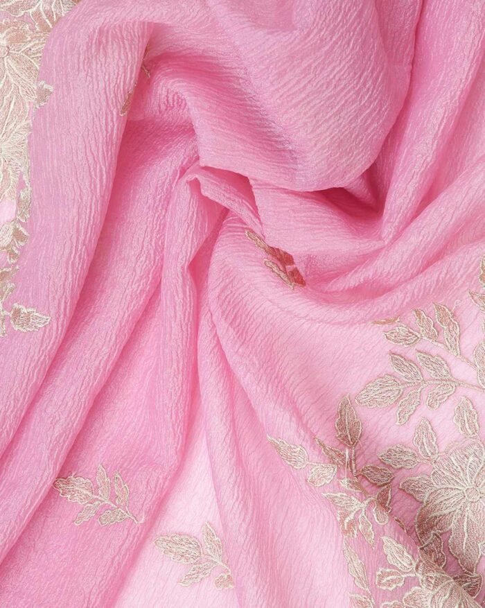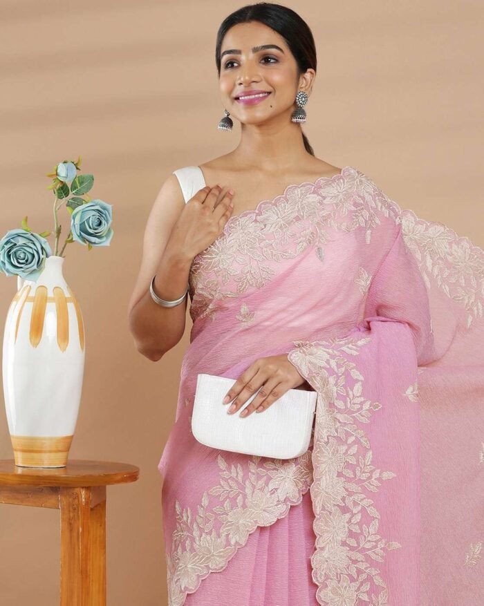 Product Details Full Of Flamingo Pink Color Crushed Organza Saree With Cream Color Thread Work Design On Body And Thick Worked Pallu With Scalloped border And Same Work Blouse Party Saree Length : 5.5 m Package contains:1 saree The last image gives a detailed look of the blouse piece that comes with this saree (The model is wearing a blouse from our in-house wardrobe) Dry clean Organza